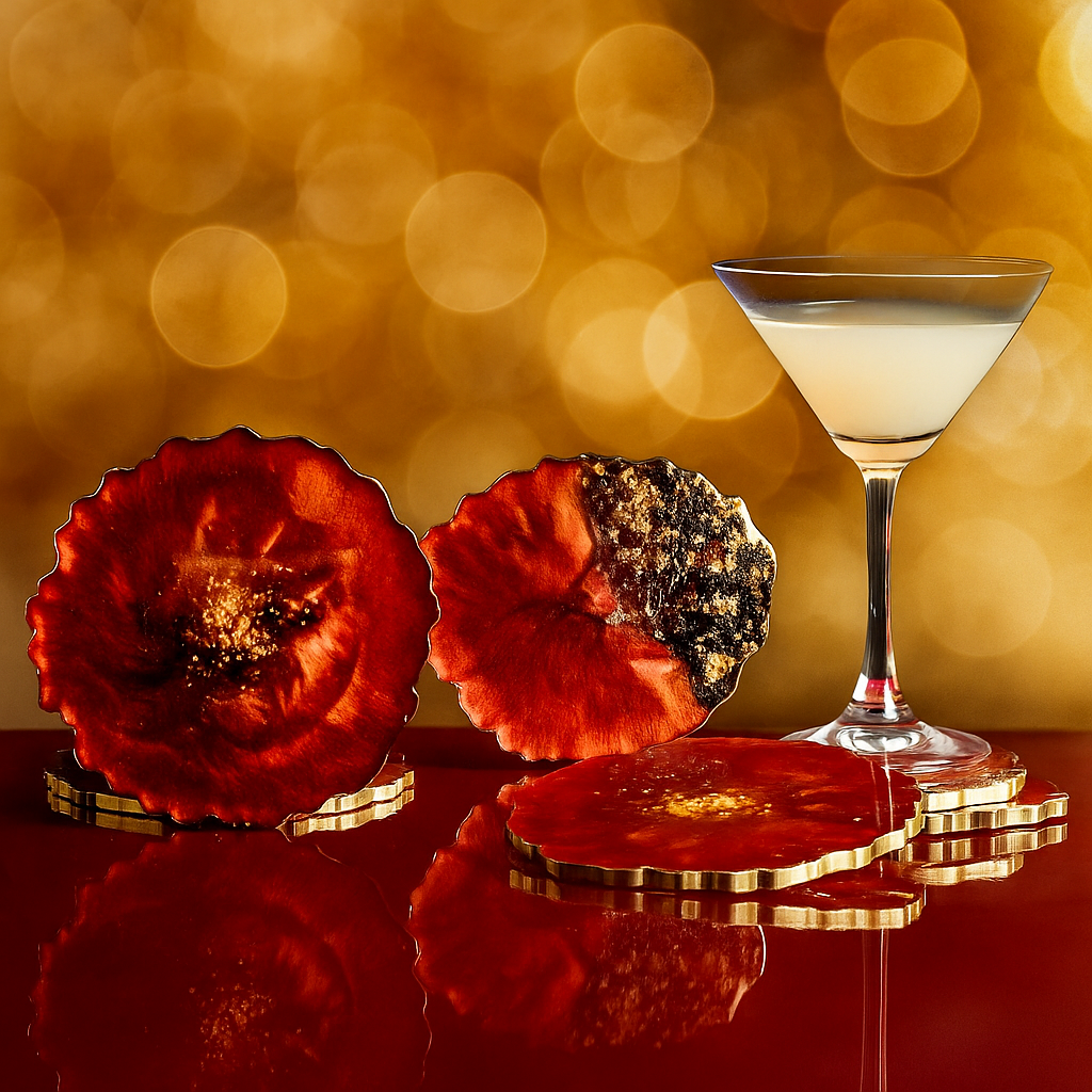 Add a touch of color and charm to your table with this beautifully handmade set of resin coasters. Each coaster features delicate red flowers preserved in clear resin, creating a vibrant accent that stands out without overpowering your décor. The glossy finish gives them a smooth, polished look, while the sturdy resin base keeps them durable and easy to clean. Perfect for coffee, tea, or evening drinks, these coasters protect your surfaces from heat and spills while bringing a cozy, handcrafted feel to your space. Whether you’re decorating your home or searching for a thoughtful gift, this set of six adds a bright, elegant touch that never goes unnoticed.