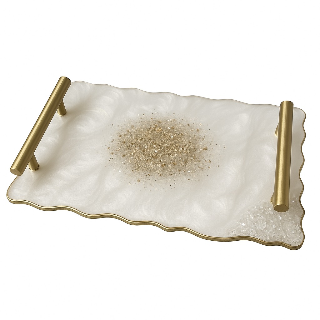 This resin plate has a deep blue base that gives it a calm, elegant look. In the center, fine gold particles catch the light and add a warm shimmer without feeling too flashy. The smooth side handle makes it easy to hold or carry, which gives it a practical touch while still looking stylish. It works well as a display piece or for serving small items. Overall, it has a clean, modern look with just the right amount of shine.